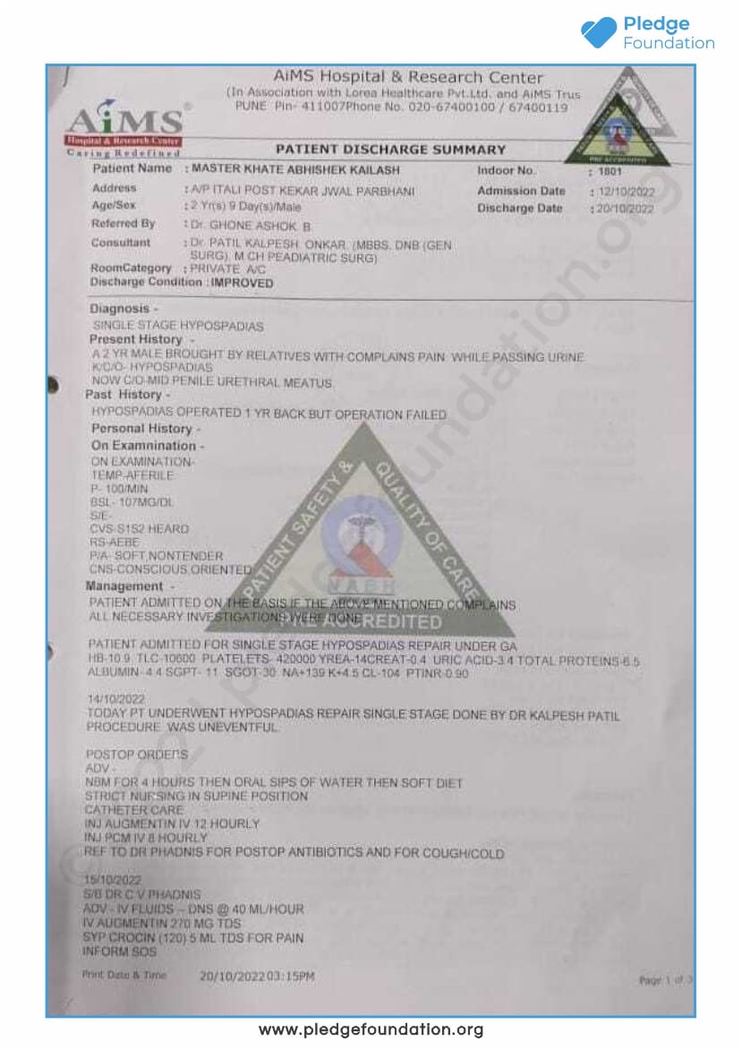 Born with a Rare Genetic Defect, Abhishek is a 2-year-old boy who was already suffering from a defect in his Penis. His first Hypospadias surgery was done 6 months before and advised to Re-do Single Stage Hypospadias Repair under General Anesthesia Surgery.